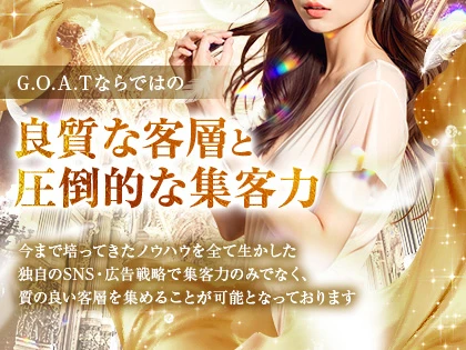 | お仕事内容 | G.O.A.Tは過激な衣装、過激サービスは一切ございません。 完全個室の"自分だけの空間"で どこよりも安全に いつも快適に 確実に稼げるルーム型高級メンズエステです。 なぜ、当店が過剰なサービスなく、安全、快適に働けてしっかり稼げるのか? その理由をご説明いたします。 ポイント1 完全個室の洗練された清潔なルーム 当店では1人1部屋の"自分だけの空間"を確保していただけます。毎日、スタッフが徹底した清掃、アメニティ(生理用品、クレンジング等)の補充を行なっている洗練された清潔なルームで快適にお過ごしいただけます。 ポイント2 G.O.A.Tならではの良質な客層と集客力 G.O.A.Tは本当の高級店が何かを知っています。今まで培ってきたノウハウを全て生かした独自のSNS・広告戦略で集客力のみでなく、質の良い客層を集めることが可能となっております。 ポイント3 充実した研修制度 しっかりとした技術こそが、過度なサービスを防ぐ方法と考えておりますので、未経験の方でも安全に働いて頂けるよう、経験者の方にはスキルアップの為に、実績のある当店の有名セラピストが接客・施術講習を行います。 ポイント4 当たり前を徹底した優秀なスタッフ ・セラピスト様との約束を絶対に守る ・必ず予約時間通りにお客様をご案内する ・LINE、電話応対は丁寧な言葉遣いを徹底する そんな簡単と思える当たり前の事を徹底する事こそが、セラピスト様、お客様からの信頼を得る第一歩だと考えております。 |