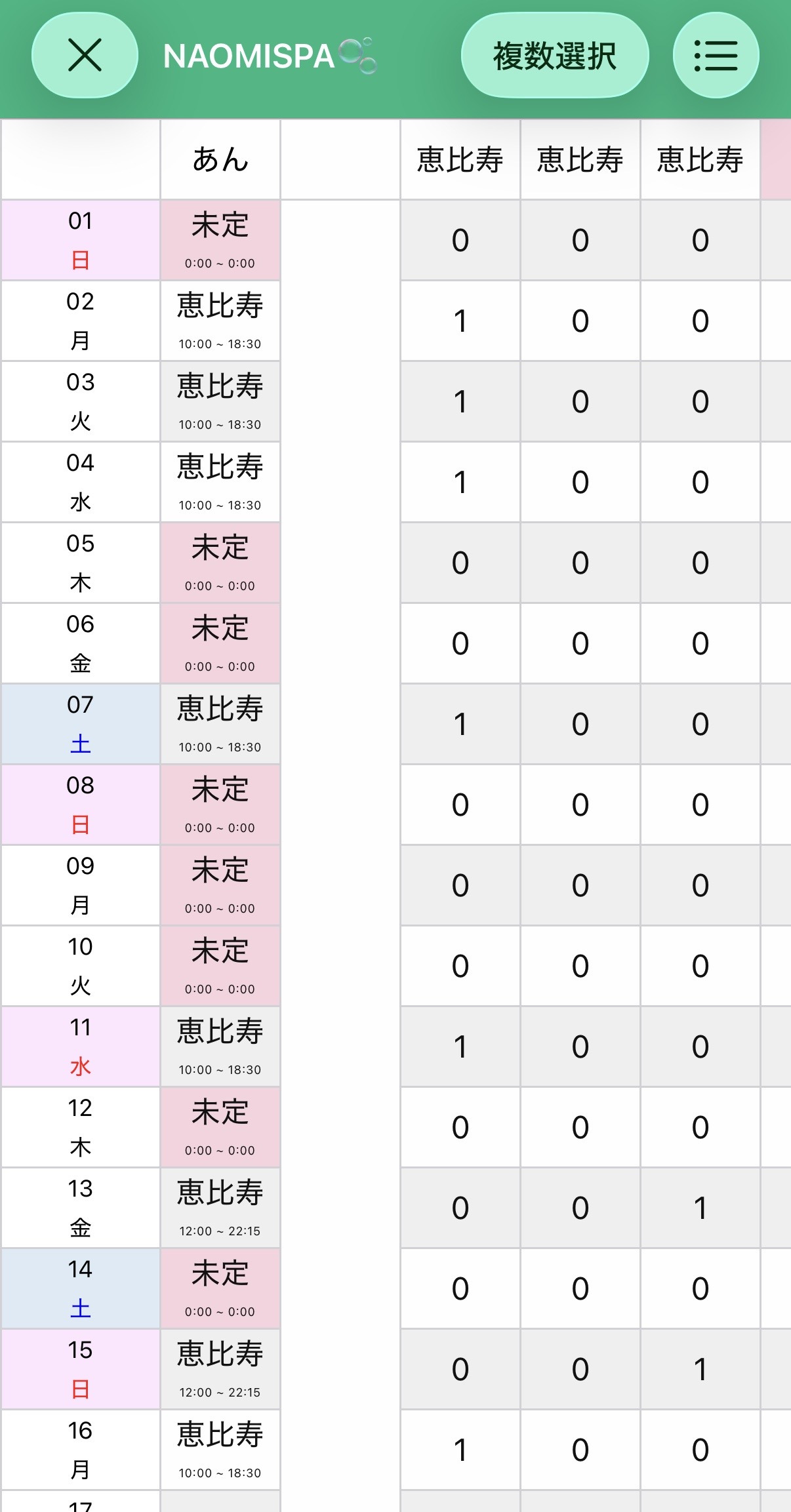 2月前半分のシフトです